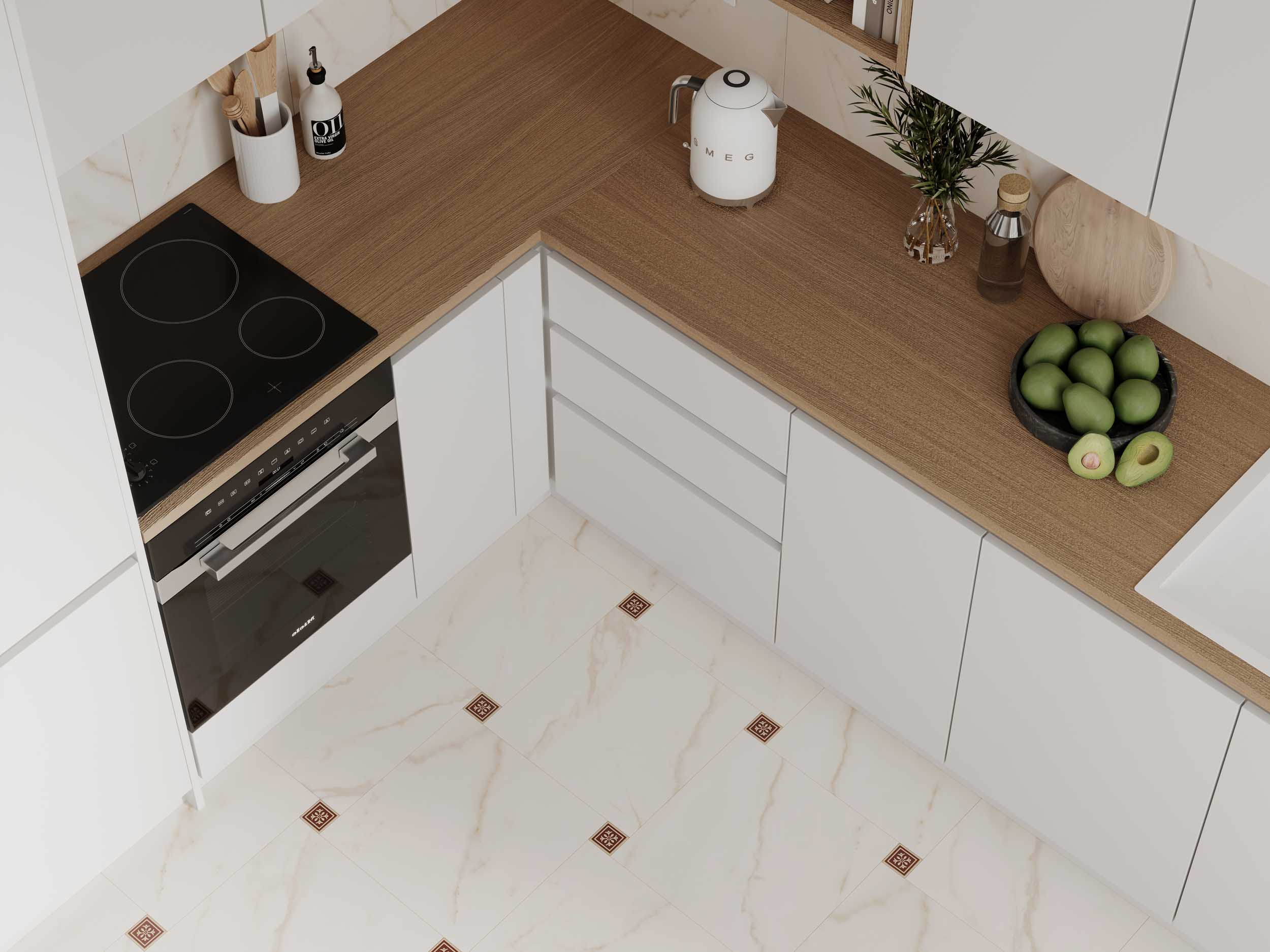 Melody — это неполированный керамогранит, имитирующий рисунок натурального мрамора. Сочетайте холодный мрамор с тактильными материалами. Например, с неполированным керамогранитом под дерево или цемент. Так вы добьетесь более уютной атмосферы в помещении.