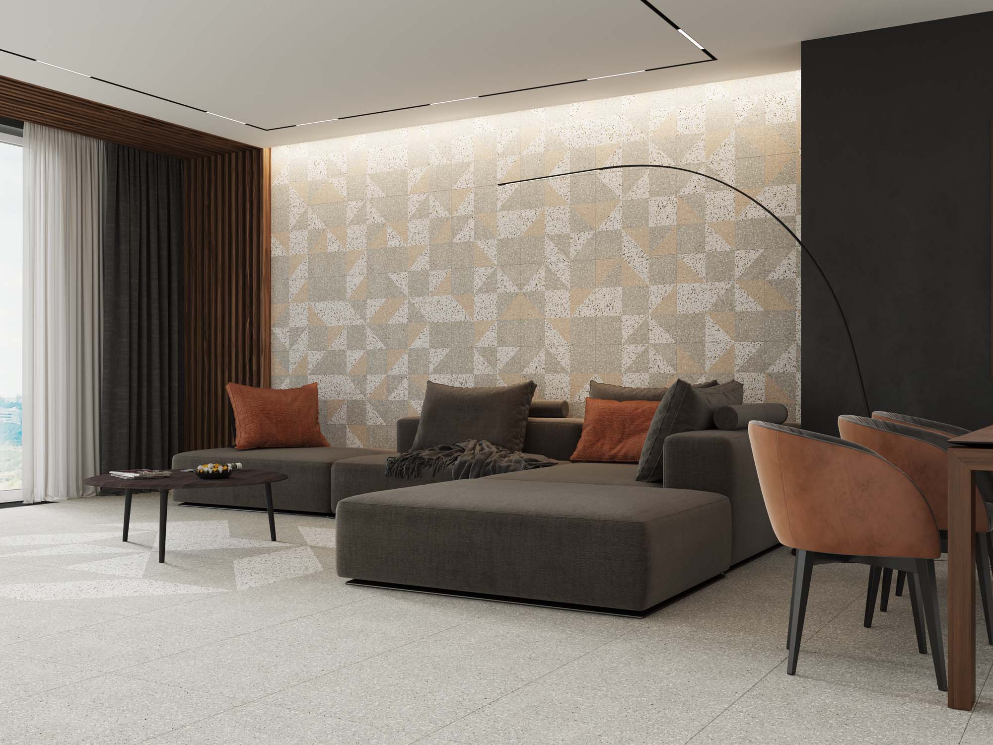 Керамогранит из коллекции Cosmos — это новый взгляд на терраццо в классическом исполнении. Подчеркнуть торжественный вид такого дизайна можно при помощи монохромной плитки. Особенно красиво светлое мозаичное покрытие смотрится с сопутствующими отделочными материалами в темных оттенках. Например, в качестве контрастного покрытия рассмотрите коллекции, имитирующие древесину.