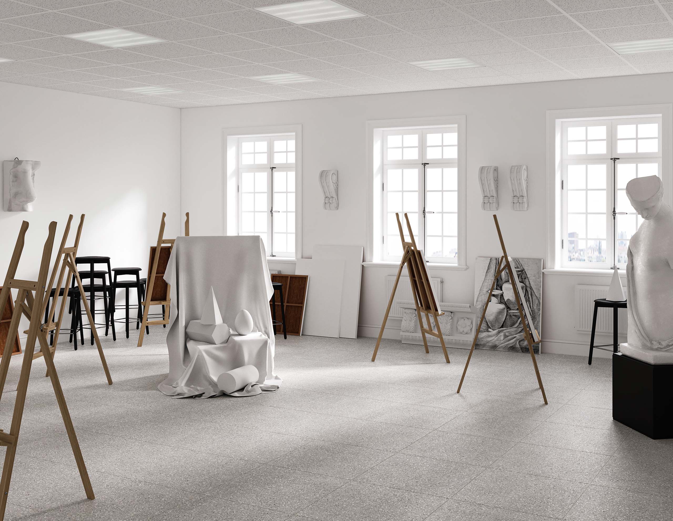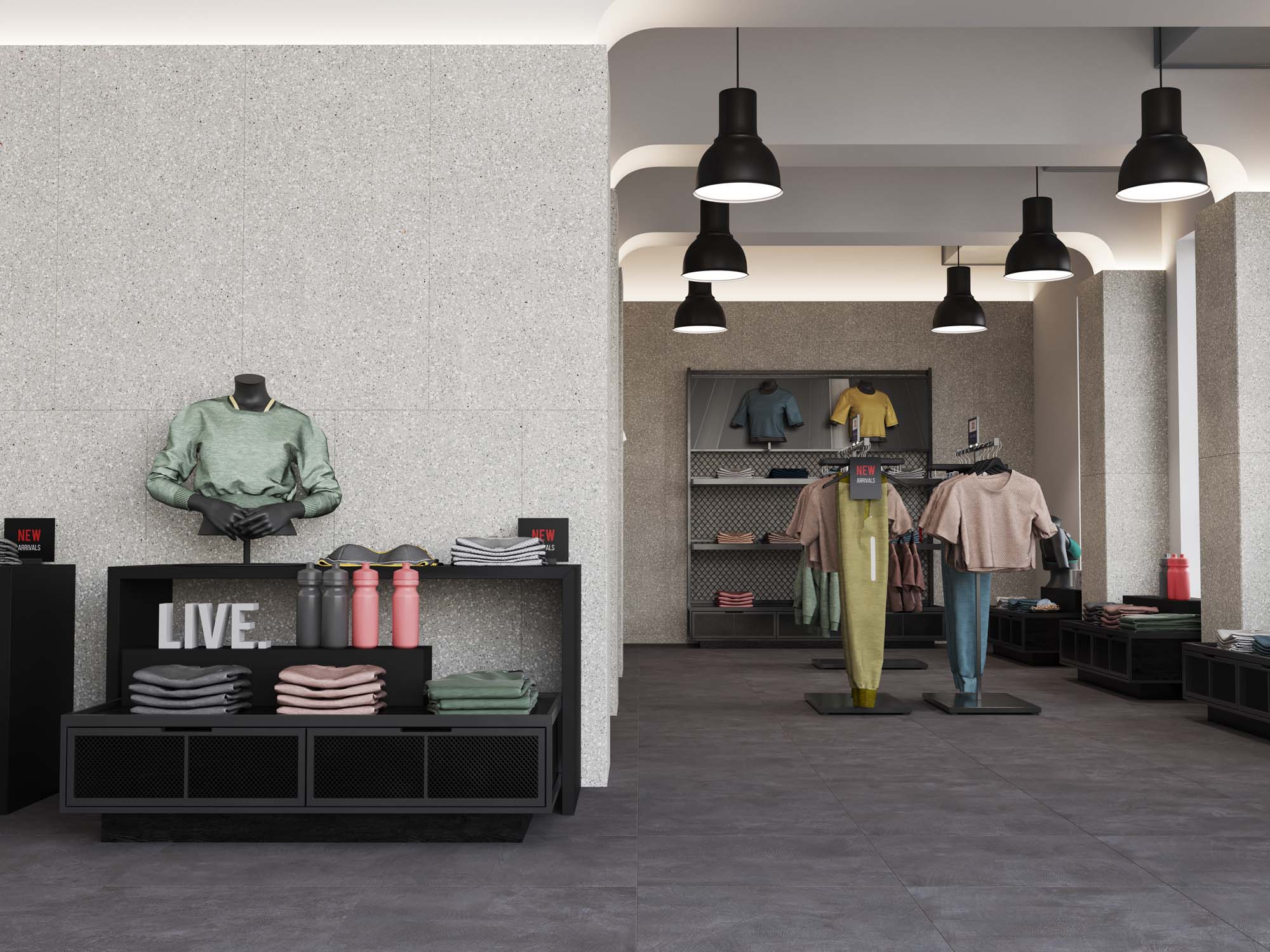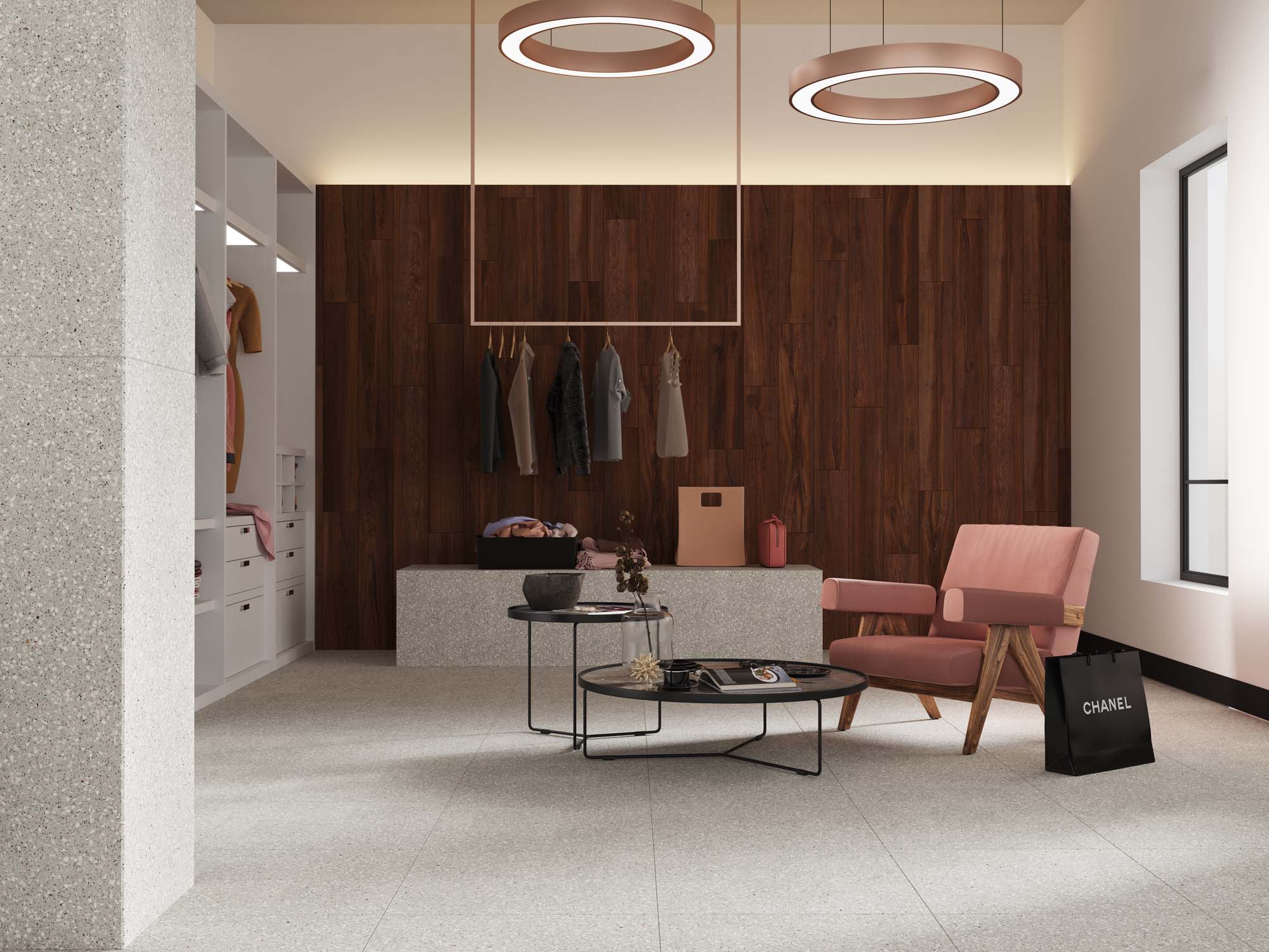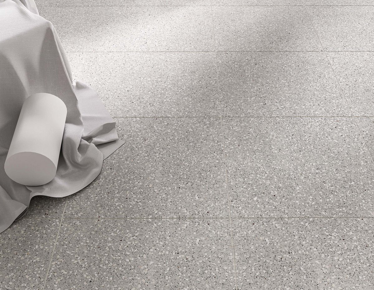 Керамогранит из коллекции Cosmos — это новый взгляд на терраццо в классическом исполнении. Подчеркнуть торжественный вид такого дизайна можно при помощи монохромной плитки. Особенно красиво светлое мозаичное покрытие смотрится с сопутствующими отделочными материалами в темных оттенках. Например, в качестве контрастного покрытия рассмотрите коллекции, имитирующие древесину.